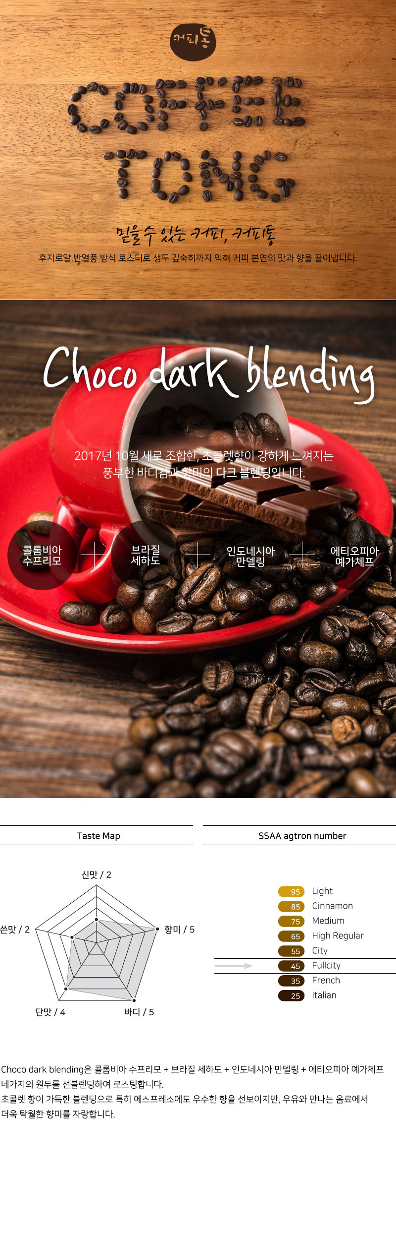 Choco dark blending은 콜롬비아 수프리모 + 브라질 세하도 + 인도네시아 만델링 + 에티오피아 예가체프 네가지의 원두를 선블렌딩하여 로스팅합니다. 초콜렛 향이 가득한 블렌딩으로 특히 에스프레소에도 우수한 향을 선보이지만, 우유와 만나는 음료에서 더욱 탁월한 향미를 자랑합니다.